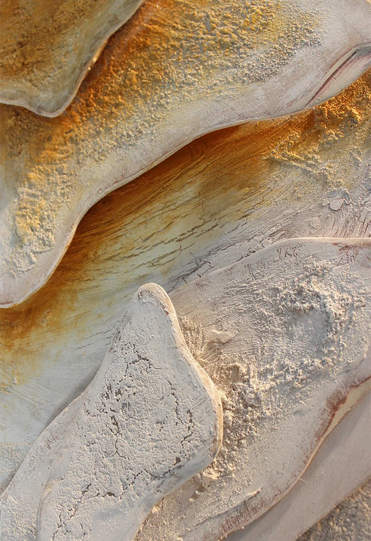 This window is an organic, installation based composition inspired by the shapes and movement of sand dunes. The topographical element of the sand dunes are highlighted by the placement of each of the wooden panels- the primary material used for this installation. Various textural treatments on the wooden panels add interest and soften and otherwise hard surface of wood. The unique shape and placement of each panel is strategic, giving the element of movement, an essential element within the sand dune ecosystem.